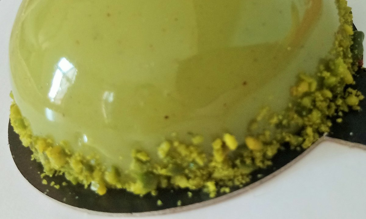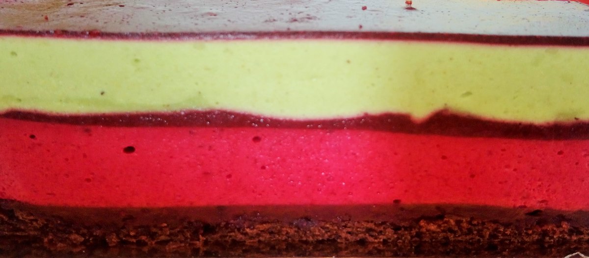 Ļoti piesātināta, spēcīga garša. Šī nav mana. Viss tik nepārprotams, intensīvs, agresīvs. Es par tām maigajām... Bet tehniski un idejiski šai arī nav nekādas vainas. Un pats, galu galā vainīgs, ka gribi maigāku! Plāna želejas kārtiņa, gaisīgs pistāciju muss, kas pats par sevi nav atsevišķi jūtams, vienīgi kalpo kā citu garšu mīkstinātājs. Tālāk upeņu kārtiņa, ļoti piesātināts upeņu muss, ļoti piesātināts šokolādes krēms un plāna biskvīta kārtiņa. No sākuma sajūti upeņu musu un tad šokolādes krēmu, kura garša ilgi neatlaiž... Traki daudz vienā kūkā!