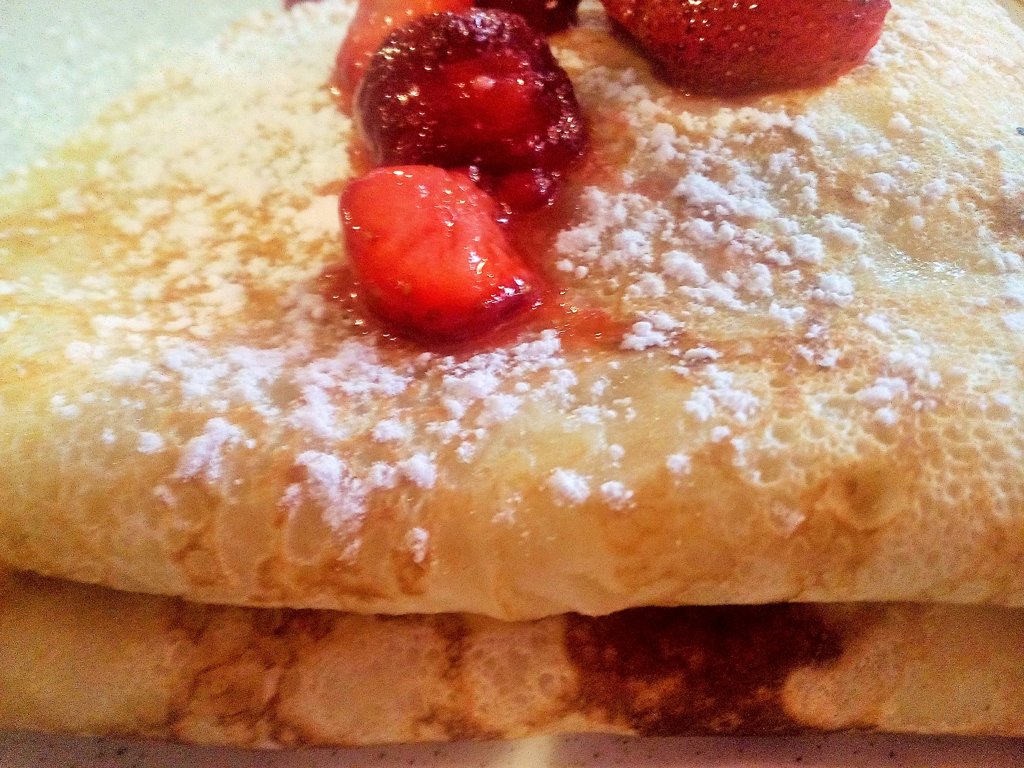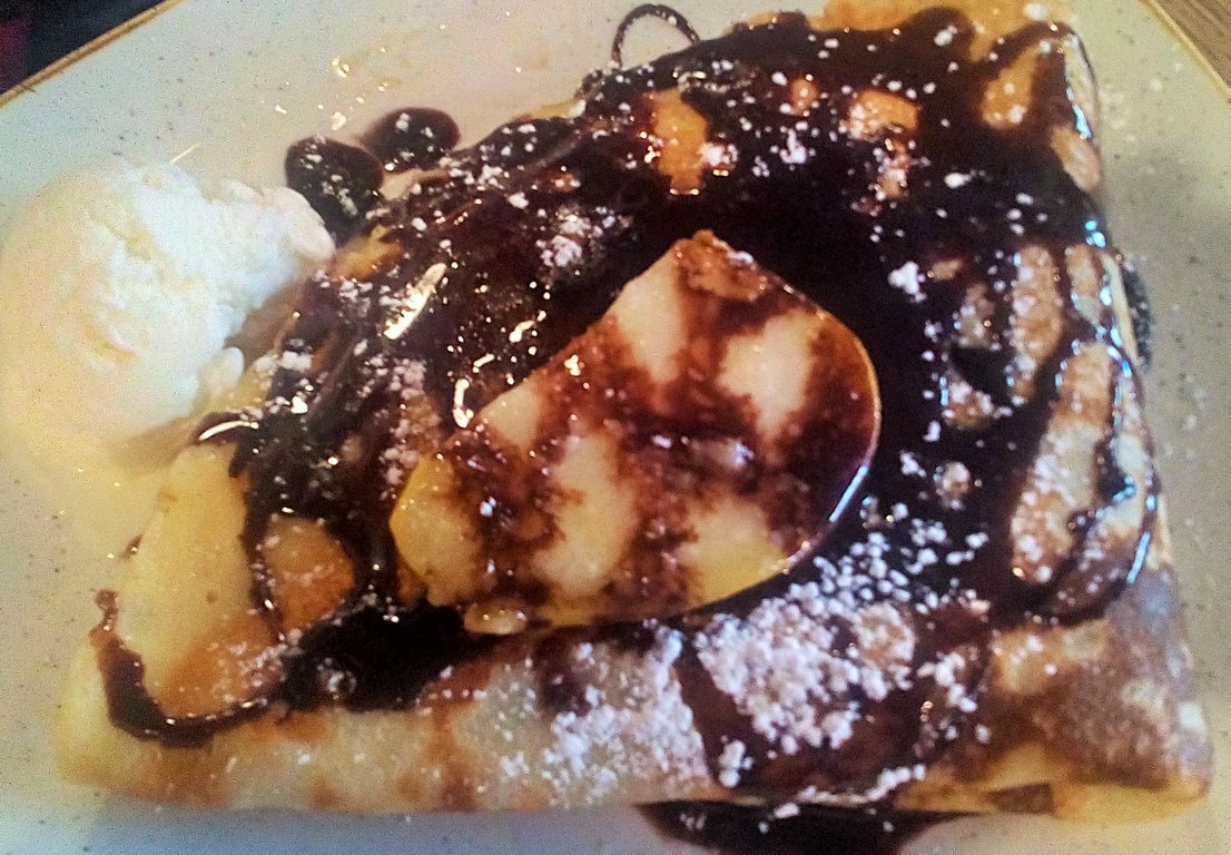 Tātad iedomājieties vienu lielu, diezgan biezu (trīs reizes biezāku par mums pazīstamo plāno) pankūku, ~ 40 cm diametrā, kas ir sapildīta ar Tevis izvēlēto pildījumu (vienu no 29) un divreiz pārlocītu uz pusēm. Ieraugot to sev priekšā, gandrīz no priekiem pietaisīju bikses! Tajā pašā mirklī sapratu, ka pat vienu tādu apēst ir liels pārbaudījums, kur nu vēl trīs, kā biju iecerējis!