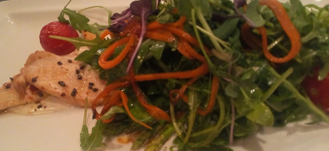 "Svaiglapu salāti ar cepinātu cāļa krūtiņu, sezamu, burkānu šifonādi, un saldu čilli mērci" (EUR 7,60)