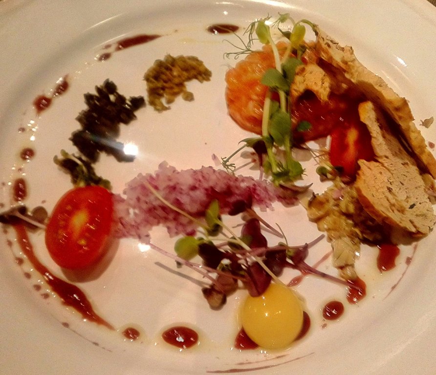 Šķīvis liels. Citējot Gordonu Ramziju (Gordon Ramsay) Izskatās tā, it kā uz šķīvja kāds būtu nogalināts. Mazās čupiņās pa šķīvi izliktas visas ēdienkartē minētās piedevas. Grauzdētā maize, nez kāpēc ir mīksta, laša tartara čupiņa šoreiz man likās krietni mazāka nekā iepriekšējā apmeklējumā.Doma nav slikta. Lasis - tāds kā ir, bez jūtamām piedevām, kam klāt pēc vēlēšanās var pievienot sīpoliņu vai kaperus, tādā veidā veidojot savu vēlamo garšu. Bet cilvēki!! Gribu ko vairāk, kā iespēju nolaizīt no šķīvja tur sagrabinātās sastāvdaļas. Kad pasūtu lasi, gribu dabūt lasi! Pielieciet pie cenas pāris eiro un dodiet ļaudīm lasi! Tas mans novēlējums!