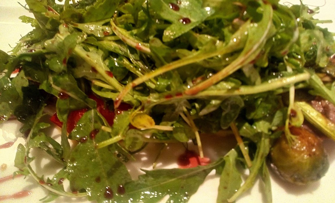 Neskatoties uz to, ka atnestais ēdiens krietni atšķīrās no mājas lapā redzamā, tas bija labs. Pirmā mirklī kad ieraudzīju porciju, domāju, ka kaut kas ir sajaukts! Uz šķīvja tikai rukola!! bet tad, nezaudējot cerību ņēmu rokās dakšu un - cik labi! Apakšā ir arī gaļa, pat varētu teikt, diezgan daudz (varēja gan būt mazāk sacepta) Un Briseles kāposti. Nezinu, vai tā bija vienkārši veiksme, vai tādi tie šeit ir vienmēr, bet kāpostiņi bija saldeni un kraukšķīgi! Apēdu un gandrīz apraudājos! Beidzot ir kas labs ko teikt! Mērcītes, salātu un gaļas proporcija ideāla! ne par sausu, ne par slapju. Ne par daudz, ne par maz! Par to, ka tur bija jābūt arī novārītiem žāvētiem ķiršiem , sapratu tikai tagad, kad pārlūkoju ēdienkarti. Bet ja pat ķiršu salātos nebija, tas nekas! Jo tur bija cepti ķirštomātiņi (nupat man radās sajūta, ka par tomātiņiem esmu pats izdomājis), bet nē, tie tur tiešām bija! Un tik garšīgi!