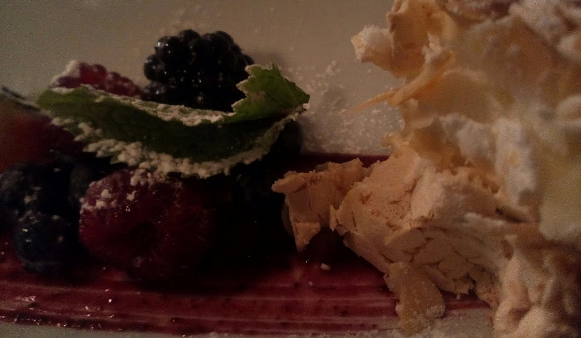 Izvēlējos "Bezē kūku ar mango un ogām". Nejauksim ar Pavlovu, lai gan visas bezē kūkas ar ogām, vairāk vai mazāk tai līdzinās. Šī bija garda. Kūkā iekšā mango gabaliņi, blakus dažas ogas, un pa šķīvi izsmērēta ogu mērcīte. Vizuāli patīkami, lai gan ne pārsteidzoši. Sajutu arī maskarponi (vai ko līdzīgu) un salīdzinot ar Creme brule, ko ēdu citā reizē, šī deserta izmērs bija optimāls.