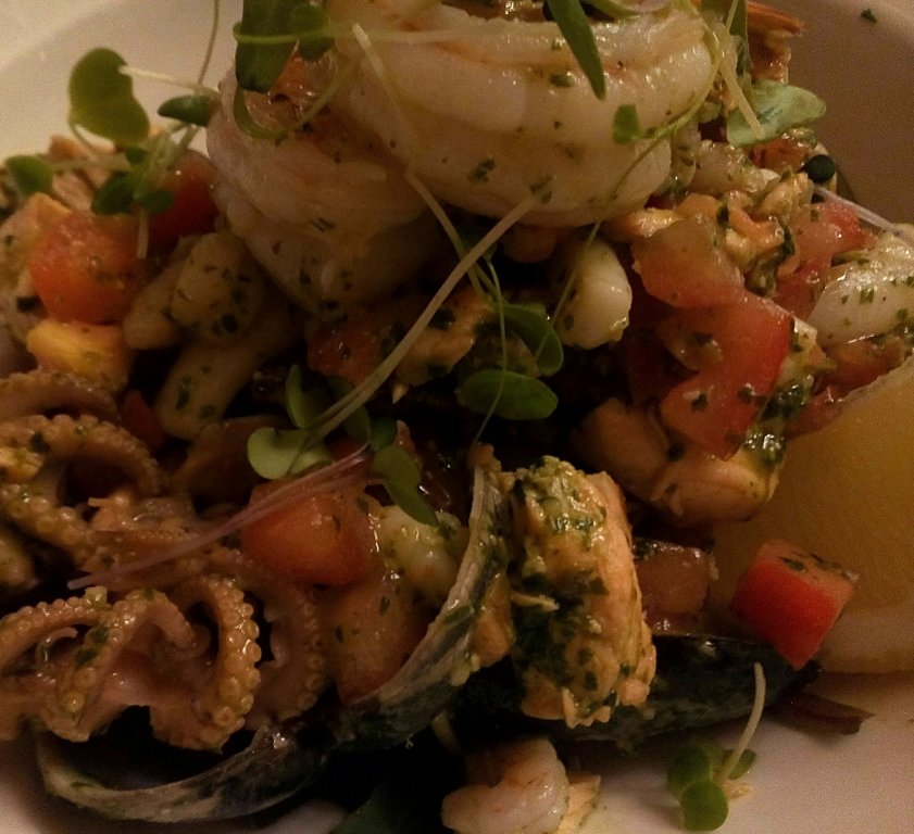 Nevaru apgalvot, ka salāti bija silti, vai, ka sapratu kāds tieši pesto ir pievienots. Un tas vairs nav svarīgi, jo šķīvis bija pilns dažādas izcelsmes, dažāda izmēra un dažādas konsistences jūras veltēm! Tas manī raisa sajūsmu! Mazie astoņkāji, mīdijas, laša gabaliņi, garneles, kas papildināti ar tādu kā salsu no tomātiem un zaļumiem. Tiešām patīkami, ka zem nosaukuma jūras velšu salāti, tiešām slēpjas tas kas rakstīts. Reti kur ēdot šāda veida ēdienu, nerodas mazuma piegarša. Vienīgi ēst no dziļā šķīvja būtu biji ērtāk ar karoti nevis ar dakšu. Bet tas jau ir tikai tehnikas jautājums.
