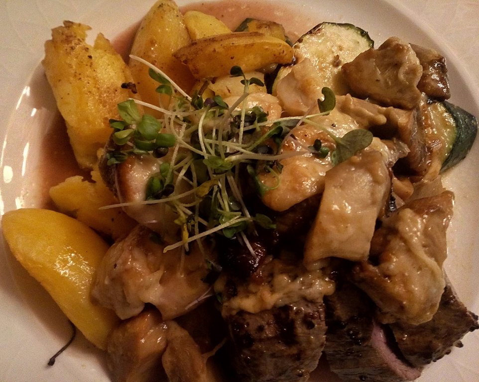 Bet rezultātā saņemu šo. Grilētu dārzeņu vietā-vārītus, apceptus kartupeļus un divas šķēles uz grila pabijuša cukīnī, par ko liecina grila atstātās apdeguma līnijas, kas acīmredzot arī bija pie vainas tam, ka viss ēdiens bija caursūcies ar deguma smaciņu. Pa virsu palieli, švammei līdzīgi baraviku gabali, kas saķepuši ar sieru, kas savukārt piešķīris sēnēm nepatīkamu uzmācīgu sāļumu, pateicoties kuram tās nebija baudāmas.