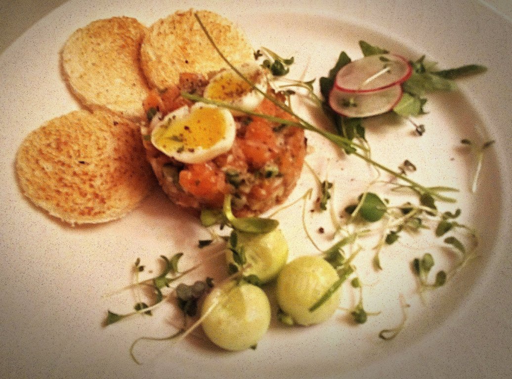 Salīdzinot ar citviet mēģināto laša tartaru, šis šķiet krietni lakoniskāks un piedāvā mazāk iespēju bagātināt laša garšu ar kādām piedevām. Iespējams, ka tas ir pareizi, jo lasis taču ir lasis un ar to viss ir pateikts! Bet man tomēr pietrūka šī iespēja - veidot savu garšu kombināciju. Klāt pielikti trīs, no tostermaizes izgriezti, apgrauzdēti plakani aplīši, bet uz tartara .... vārīta paipalu oliņa. Un atkal pārsteigums! Līdz šim nekad nebija dzirdēts par vārītu paipalu olu uz tartara. Tikai, un vienīgi jēla! Bet iespējam, ka šī ir kāda īpaša versija par tartara tēmu, jo divas plānas redīsa šķēlītes un trīs izgrebtas gurķa bumbiņas nav īsti tās piedevas, ko sagaidām ieraudzīt blakus lasim. Ēdiens vairāk baudāms ar acīm nekā ar garšas kārpiņām, jo šeit vienkārši nav nekādu īpašu garšu.
