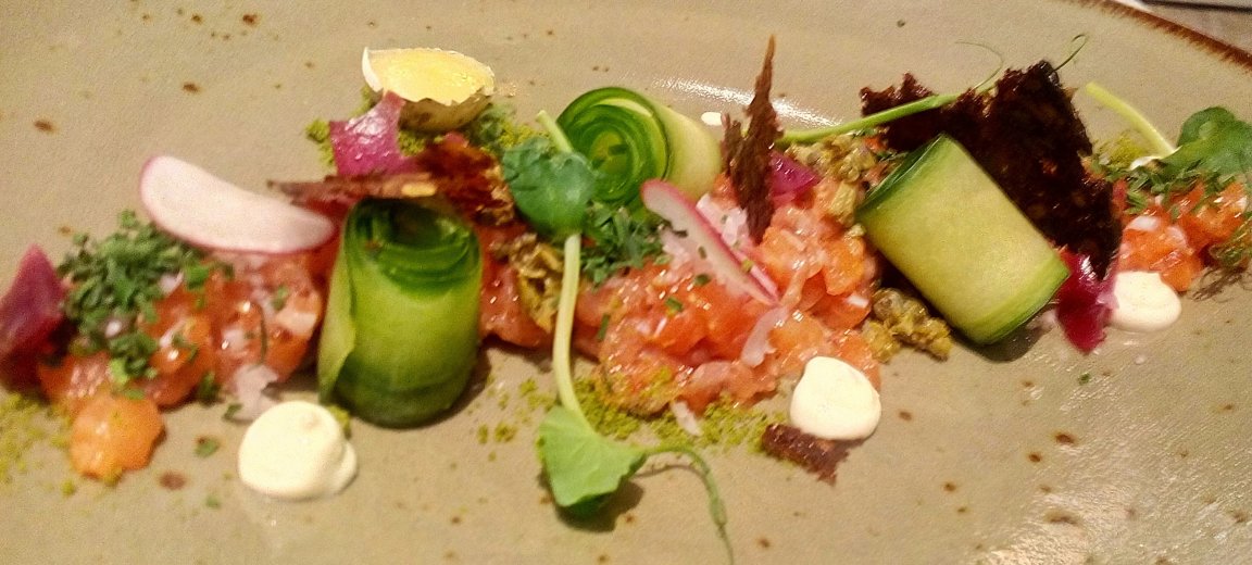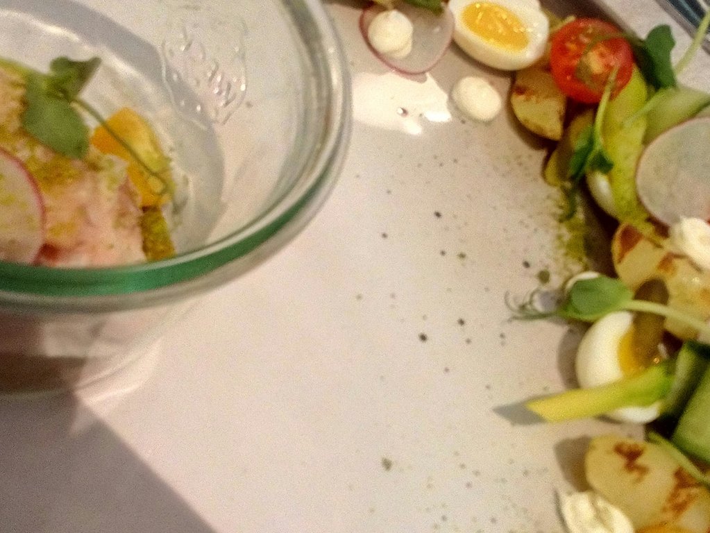Ēdiens šeit tiek pasniegts uz tonētiem māla traukiem, kas manuprāt būtu vairāk piemēroti kādam latviešu virtuves iestādījumam, bet šoreiz tas lietas būtību nemaina. Pirmā mirklī porcija pārsteidz ar daudzām krāsām un patīkamo izskatu, bet kā jau vairākkārt iepriekš atzīmēju, pavāri pārāk daudz uzmanības sākuši pievērst ēdiena noformējumam un aizmirst par to, ka galvenais ir kvalitāte un garša. Un ar to šeit ir lielas problēmas.