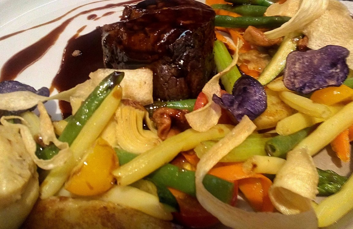 "Liellopu steiks ar sezonas dārzeņiem, sviestā apceptām gailenēm un sarkanvīna rozmarīna mērci" EUR 17,50