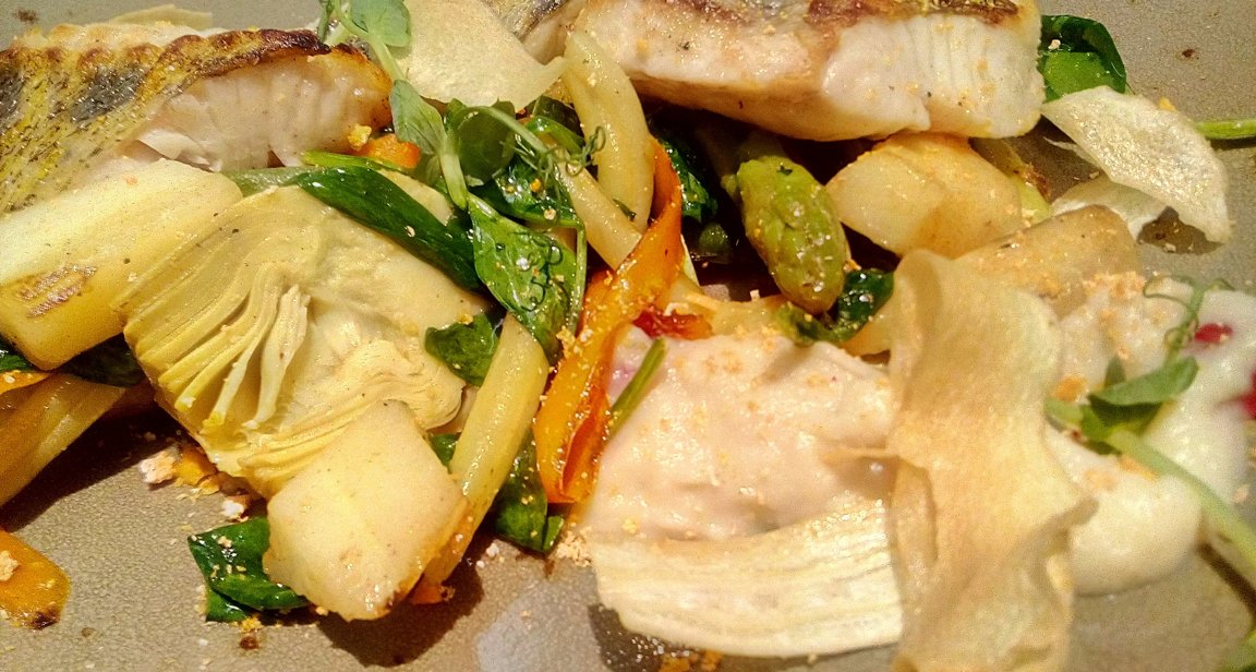 Divi zivs gabaliņi bija pilnīgi bezgaršīgi, bet trešais ar nelielu piegaršu, kuras izcelsmi nevarēju noteikt. Par sautētiem dārzeņiem man nav ko teikt, vienīgi varu tos nosaukt - sparģeļi, dzeltenās pupiņas, spināti, burkāni, kartupeļi, artišoka gabaliņš. Atkal tā pati problēma, garšas trūkums. Lasot - dzērveņu ziedkāpostu biezenis, savā galvā iedomājos šo abu produktu sajaukumu, kas iespējams, veido kādu interesantu garšu, bet dzīvē saņēmu ziedkāpostu biezeni, kas nepāŗprotami bija blendēts, jo pēc konsistences atgādināja klīsteri un dažas dzērvenes, biezeņa vidū. Kas tā tāda gaileņu-griķu švamkūka tā arī neuzzināju, jo uz šķīvja tās vienkārši nebija.
