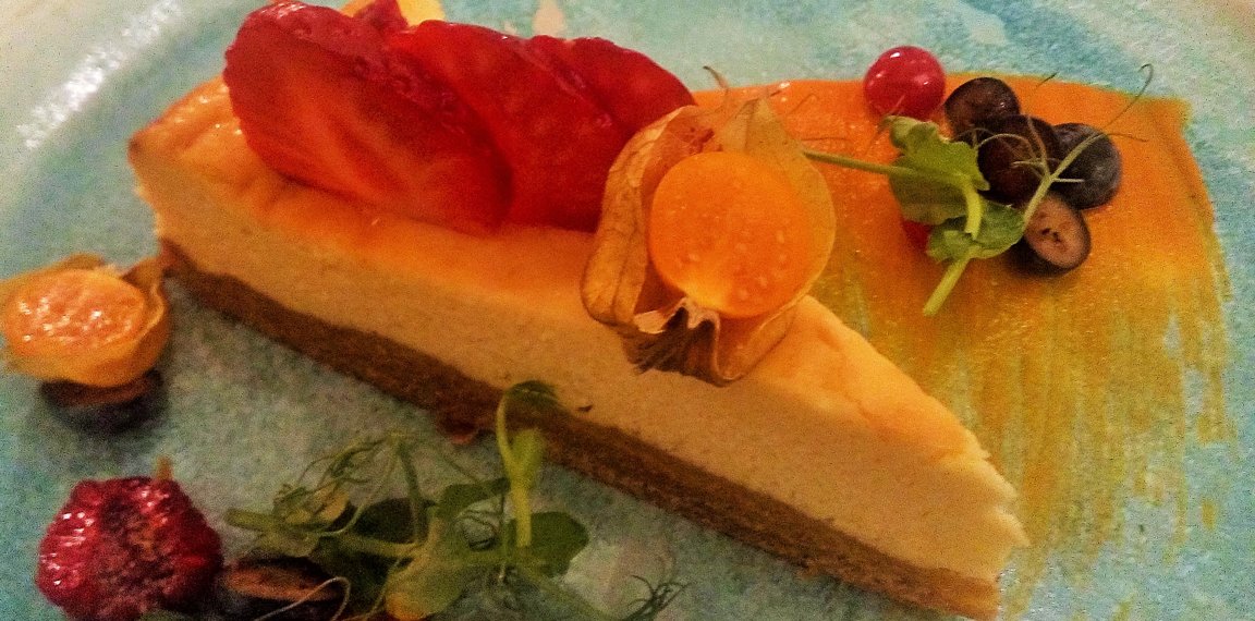 "Smiltsērkšķu siera kūka ar burkānu gēlu, zemeņu mērci un ogām EUR 5,50"