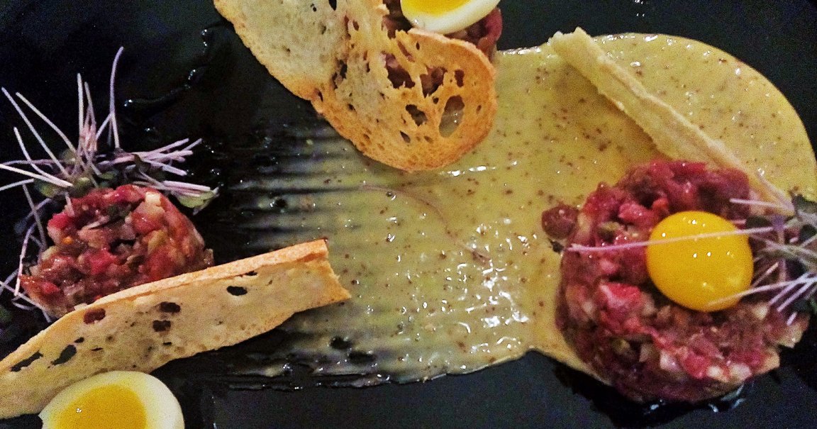 Kādu laiku atpakaļ stāstīju, ka esmu noguris no tartariem, jo tie, tāpat kā Creme brulē, visur ir +/_ vienādi, vien atšķiras to servēšanas veids un tas vai piedevas ir sajauktas kopā ar gaļu, vai izliktas uz šķīvja atsevišķās kaudzītēs, lai ēdājs pats var kombinēt sev pieņemamākās garšu kombinācijas, cik nu tas ir iespējams, izmantojot sīpolu, kaperus un marinētu gurķi.